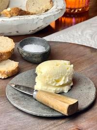 Add the butter to a cutting board or serving tray and use the back of a spoon to smear the butter around the board so it’s about 1/4 inch thick.